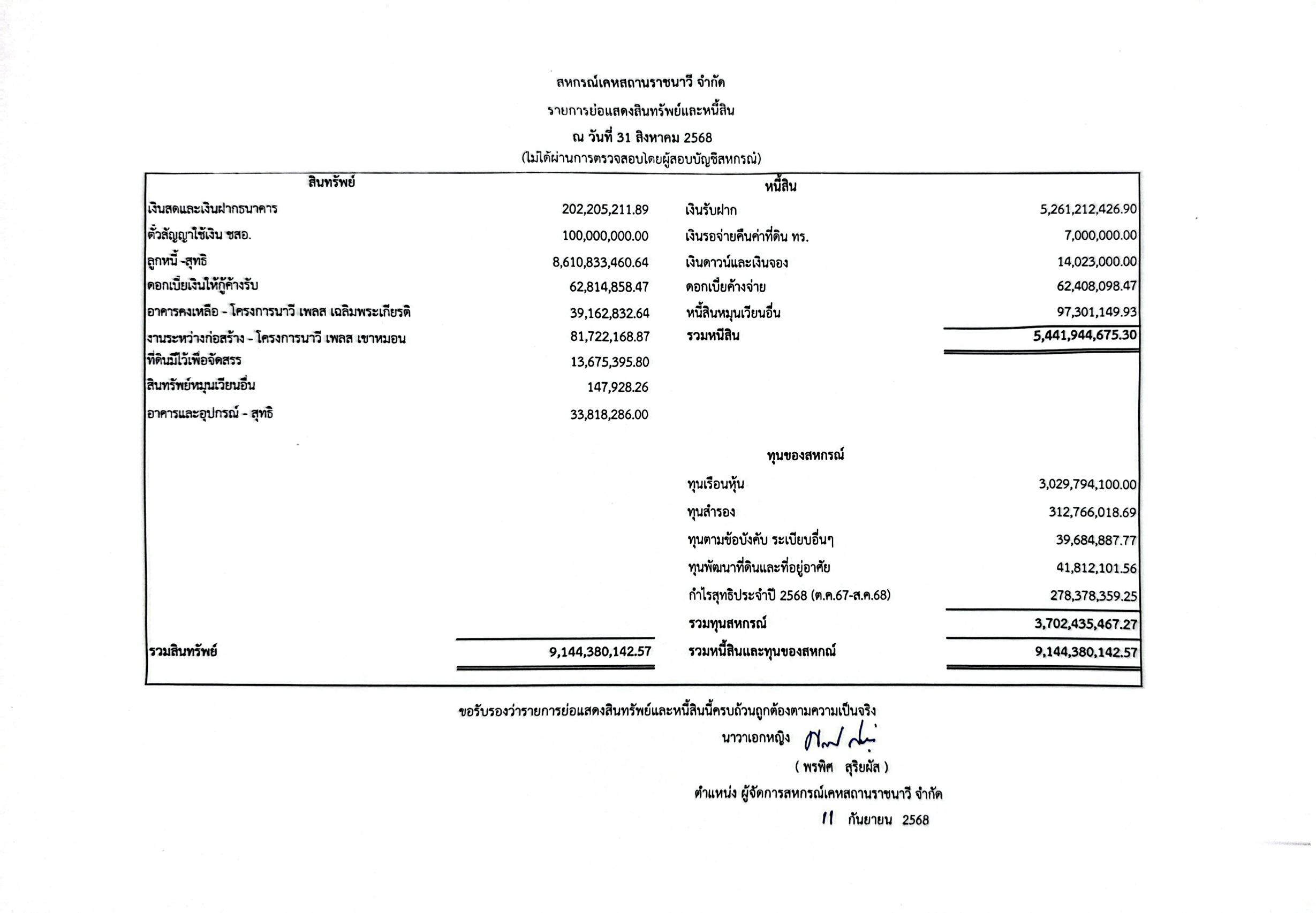 รายการย่อแสดงสินทรัพย์และหนี้สิน ณ วันที่ 31 สิงหาคม พ.ศ.2568