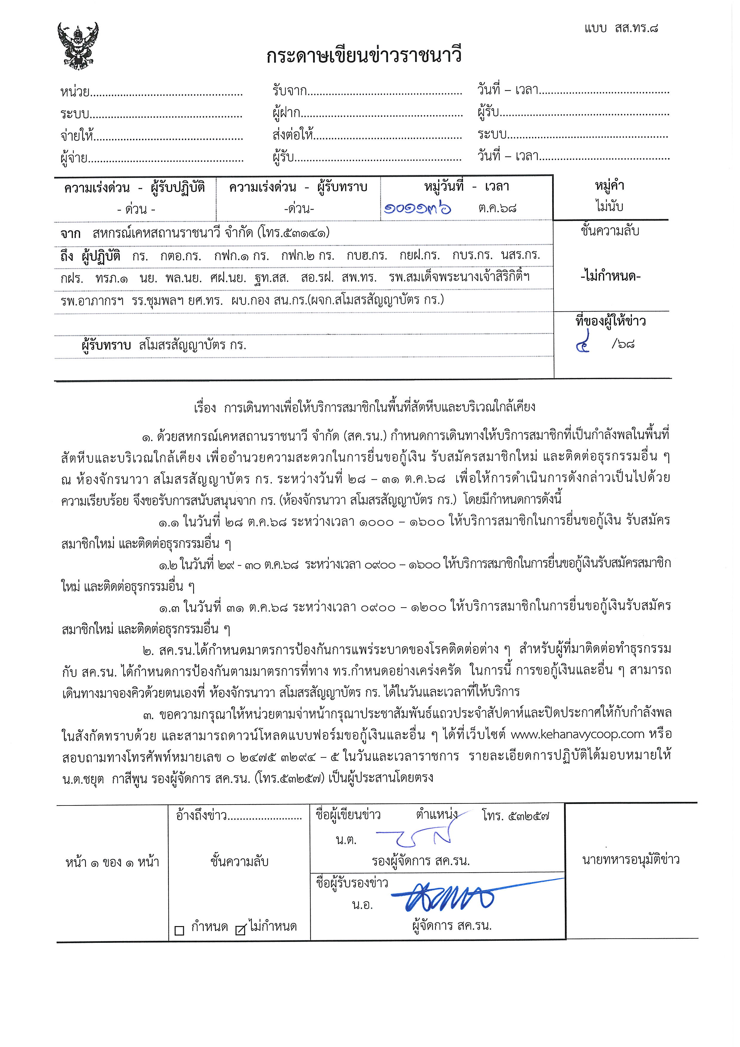 กำหนดการเดินทางไปบริการสมาชิกพื้นที่สัตหีบ วันที่ 28 - 31 ต.ค.68 ณ ห้องจักรนาวา สโมสรสัญญาบัตร กร.